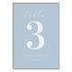 This elegant wedding table card features a minimalist design with a soft pastel blue background. The layout is clean and balanced, showcasing a large numeral "3" in bold white font at the center, complemented by cursive script for the word "table." Customizable names and date are presented in a modern sans-serif typeface, adding a touch of sophistication. The overall mood is serene and understated, perfect for creating an inviting atmosphere at your special event.