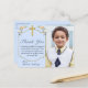 Thank your family and friends for attending your son's 1st communion or giving him a gift with this elegant gold cross First Holy Communion thank you postcard. A pale blue background on both sides of the thank you postcard set an elegant tone with soft floral bouquets in peach, blue, and cream that decorate the top corners. A simple gold cross honors the center of this boy's communion thank you postcard. Personalize with your return address on the back of the postcard, your child's name and a special note, as well as a photo of your child.