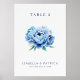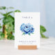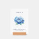 This is a minimalist style image featuring a beautiful, soft blue peony at the center. The delicate petals are rendered in various shades of blue and green, creating an elegant and serene atmosphere. Above the flower, "TABLE 2" is written in simple, classic typography, while below it reads "ISABELLA & PATRICK Saturday, June 6, 2026," indicating this might be part of wedding stationery. The overall mood is calm and sophisticated, perfect for adding a touch of natural beauty to any event setting.