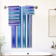 Bathroom towel set with an abstract artistic stripe pattern in teal blue and purple with white.