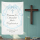 A cute blue ribbon and bow surrounds your elegant confirmation party banner to celebrate your little boy. A beautiful Christian cross is above the details for your baptized child. Lovely religious decor for your Catholic baptism or confirmation ceremony.