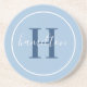 Elegant round personalized beverage drink coaster design features a classic custom serif monogram initial in a cobalt blue color with your last name in modern white calligraphy script against a dusty powder blue colored background. A simple white circle frames the design. Color scheme can be customized to coordinate perfectly with your home decor.
