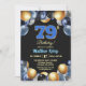 An elegant modern design featuring blue 79 number with gold edges and balloons with silver, blue and gold glitter and a special photo of the birthday person on the back of the invitation. Customize the details for a unique and chic Birthday Celebration.