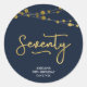 This elegant 70th birthday round sticker feature strings of lights and the word "Seventy" in faux gold against a dark blue background. Check out other matching items here https://www.zazzle.com/collections/strings_of_lights_faux_gold_celebration_collection-119311942951401241?rf=238364477188679314