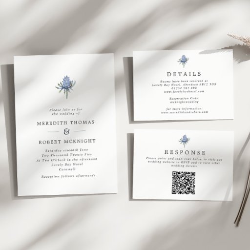 Elegant Blue Watercolor Thistle Wedding Menu perfect for a Scottish wedding. "menu" is in modern calligraphy font. Personalize with your names and wedding date and menu.