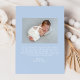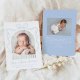 Celebrate your baby’s arrival with this charming photo birth announcement card. The design features a unique arch-shaped photo framed by a delicate, hand-drawn blue bow and ribbon on a white background, blending sweetness and elegance. Personalize the front with your little one’s name in playful blue script, birth details, and family names. The back includes space for a second photo and a heartfelt personal message, creating a perfect keepsake for loved ones. This design is perfect for welcoming baby boys.