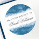 Elegant, trendy book labels or bookplate stickers featuring blue watercolor borders top and bottom. Customizable dark gray text: "This book belongs to [Name Surname]"
