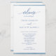 Elegant blue Wedding program featuring delicate blue watercolor border stripes framing your wedding program details. Ability to make text changes and adjustments by selecting customize further. Front with wedding ceremony details, back with wedding party names and thank you message for your guests. Elegant, simple and graceful feel. Part of our "Blue Watercolor Botanical Monogram Wedding" Collection with a variety of coordinating products available, including menu, table seating chart cards, table numbers, thank you cards and more. Visit the entire collection with this link: https://www.zazzle.com/collections/blue_watercolor_botanical_monogram_wedding-119923294821263262