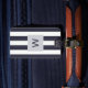 Simple elegant customizable luggage tag design with blue / white stripes and your monogram.