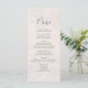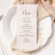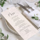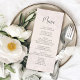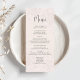 This design features an elegant floral simple menu card menu card, blush flower greenery foliage, calligraphy script minimalist dinner, greenery foliage table party decor, simple place seating typography, stylish trendy calligraphy script, romantic dinner party elegant reception, rustic botanical dinner nature garden, food course meal earth tones, elegant garden dinner menu card
