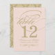 NOTE: Each table number card must be customized and individually added to the shopping cart. Elegant pastel blush pink card includes a flourished monogram with champagne gold calligraphy and scroll design accents, and damask pattern on the back of the card.