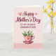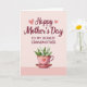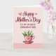 This card features a soft gradient background that shifts from blush to rosy pink, setting a gentle, affectionate mood ❤️. Near the top, a flowing maroon headline announces the occasion, with two small light-pink heart outlines floating nearby like a quiet nod between close hearts. Just beneath that, a shorter line of uppercase maroon text sits centered, clearly naming who the message is for. In the lower section, a bright pink teacup and saucer appear, trimmed with tiny touches of gold and a heart emblem on the cup’s front. The cup is filled with small white bell-shaped blossoms, arranged like a sweet offering shared across a table. Fresh green leaves peek out around the flowers, adding contrast and a cozy, gift-like feel 🌼. The pink teacup sits on a matching saucer, with the gold accents catching the light against the pastel background.