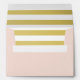 Custom striped 5 x 7 envelopes feature a blush pink background color with stylish gold colored return address that can be personalized on the back flap. The inside of the envelope features a pattern of gold and white horizontal stripes.