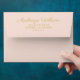 A blush pink wedding mailing envelope with beautiful gold calligraphy script guest addressing on the front. The warm gold lettering pairs beautifully with the soft pink background, and the interior is printed in a coordinating blush tone for a polished tonal look. Personalize the return address with your names and details.
