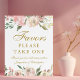 An elegant floral foam board sign for wedding favors decorated with beautiful blush pink roses and peonies. A lovely sign for a spring or summer garden wedding ceremony written in chic antique gold script. Please take one.