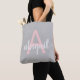 Customized monogrammed script name and initial modern and elegant girly Blush Pink and Grey (Gray) Add Your Name Tote Bag are personalized and perfect for Sweet 16, 1st, 21st, 30th, 40th, 50th, 60th, 70th, Birthday Party, Weddings, Quinceanera, Bridal Shower, Bachelorette Party, Holiday Gift, Shopping, Anniversary or Baby Shower.
