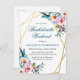 Soft blue, pink, and white boho watercolor flowers within a gold double geometric frame feature botanical and berry flourishes. Customize this elegant boho floral bachelorette weekend itinerary invitation postcard with your own colors and fonts or keep this popular typography as it is for your convenience. MIx and match with other items in this beautiful wedding collection.