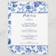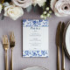 Elevate your wedding reception with this elegant botanical-themed menu, designed to complement a classic and timeless celebration. The sophisticated floral border in deep blue frames the central text, offering a graceful and refined presentation for your guests. With a white vintage-inspired background design brings a touch of old-world charm to your modern celebration. Perfect for adding an extra layer of beauty to your table setting, this menu guides your guests through the delicious courses planned for your big day. Ideal for couples seeking an elegant, traditional aesthetic for their wedding.