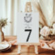 This refined wedding table number card features a minimalist black and white design highlighted by a romantic dove and floral crest above the couple’s names. The elegant combination of serif and handwritten script fonts adds a modern touch to the classic layout, while the bold table number ensures easy visibility for guests. Ideal for formal receptions, black-tie weddings, or elegant destination celebrations, this design coordinates seamlessly with other matching stationery and décor elements to create a cohesive and sophisticated table setting. It’s the perfect finishing touch to help guide guests with timeless style.