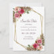 Elegant chic botanical Save The Date card features romantic floral watercolor displayed in leafy greenery on a classic white background. A sparkling golden color geometric crystal-shaped frame provides a trendy touch. Traditional, classic wording provides timeless sophistication. Personalize wedding details for your guests in elegant purple cassis lettering and script. The back of the card is beautiful matching purple cassis.