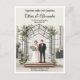 Elegant wedding postcard featuring a modern botanical garden theme with an illustration of a couple standing under a stylish conservatory arch. Surrounded by lush greenery and a classic greenhouse backdrop, this design is perfect for botanical garden, greenhouse, or spring weddings. A budget-friendly invitation option that is fully customizable for your special day.