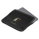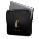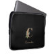Elegant black laptop sleeve features a gold botanical monogram in the center.