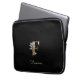 Elegant black laptop sleeve features a gold botanical monogram in the center.