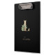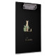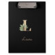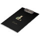 Elegant black clipboard features a gold botanical monogram in the center.
