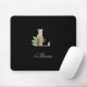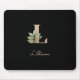 Elegant black mouse pad features a gold botanical monogram in the center.