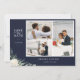 Elegant watercolor botanical foliage and white floral arrangement, save the date 3-photo card. Features, navy blue color backgrounds, white typography and calligraphy "the" accent graphic.