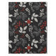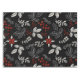 Elegant botanical pattern on black background featuring white leaves, red berries, and intricate floral designs in gold accents, creating a festive, decorative feel.