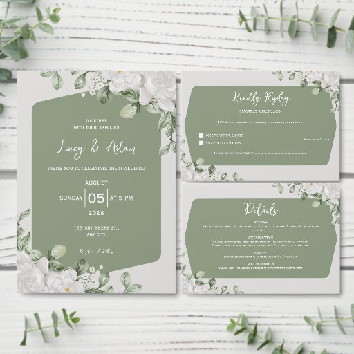 Complete your wedding stationery suite with this elegant botanical envelope design in soft sage green and white floral accents. Perfect for modern, romantic, and nature-inspired weddings, this envelope adds a refined touch of greenery charm to your invitation set. Ideal for couples seeking a minimalist yet luxurious aesthetic, it pairs beautifully with matching invitations, RSVP cards, and save-the-dates for a cohesive botanical wedding theme.