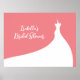 An elegant wedding dress accents this bridal shower poster on a coral background. This is part of the Elegant Bridal Shower Collection in coral. If additional coordinating items are needed just contact us at prettyfancyinvites@gmail.com with your request.