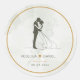 An elegant wedding thank you sticker featuring a romantic bride and groom silhouette with a soft floral background and refined gold circle border. The graceful artwork and delicate neutral palette create a timeless look that is perfect for formal weddings, romantic celebrations, and coordinated stationery suites. A beautiful choice for couples who love classic wedding details with a polished and sophisticated feel. This sticker adds a lovely finishing touch to favor bags, gift packaging, envelopes, and thank you accents.
