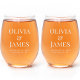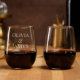 Chic personalized etched stemless wine glasses for the bride and groom to celebrate with at their engagement party, rehearsal dinner, wedding reception anniversary and other events. Personalize with your names, wedding date and location in elegant serif typography. You can edit in the design tool to increase or decrease the font size for longer or shorter names.