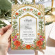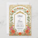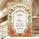This romantic wedding invitation features a vintage-inspired gold arch adorned with richly colored roses in orange and fushia pink with delicate greenery. The detailed floral border frames your names and wedding information with warmth and elegance, while the baroque arch design adds a refined, timeless touch. The soft yet bold palette makes this invitation a beautiful fit for spring or summer weddings, especially those held in gardens, estates, or outdoor venues.