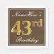 This simple and elegant paper napkin design features a message like "NameHere’s 43rd Birthday" (with the "43rd" having a faux gold-like coloring) within a brown-colored square area featuring a simple border outline. The name is in a white-colored script-like text, and can be customized. Napkins like these could perhaps be used at a birthday party for somebody who is celebrating their forty third birthday. [~Z0000139]