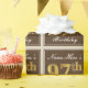 This simple and elegant wrapping paper design features a personalized message like "Name-Here’s 97th Birthday" (with the "97th" having a faux/imitation gold-like coloring look) within a brown-colored square area featuring a simple border outline. The name is in an elegant white-colored script-like text, and can be customized. Wrapping paper like this could perhaps be used when wrapping birthday gifts for somebody who is celebrating their ninety seventh birthday. [~Z0000223]
