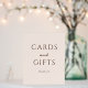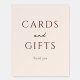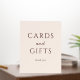 This elegant tabletop sign features a minimalist and sophisticated design, perfect for wedding decor. The text "CARDS and GIFTS thank you" is presented in an understated yet refined typography style, set against a soft pastel background that exudes warmth and gratitude. The color palette of muted browns and creams creates a harmonious and inviting atmosphere, ideal for expressing heartfelt appreciation at your special event. Its simple yet graceful aesthetic ensures it complements any wedding theme while maintaining a timeless charm.