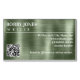 An elegant business card magnet featuring a faux brushed green foil background, white text, and a QR code.