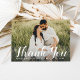 A striking and romantic wedding thank you card featuring a full-bleed couple photo with a large elegant brushed calligraphy "Thank You" script sweeping across the lower half of the card. The couple's names and wedding date are fully editable for a personal touch. The expressive brushed script gives this card a timeless yet modern feel perfect for any wedding style. The folded card interior is available for a handwritten note or custom printed message.