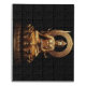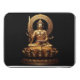 A majestic figure of Buddha is gracefully seated atop a blooming lotus pedestal. Clad in intricate golden robes, the deity holds a sword in one hand and a sacred scripture in the other, embodying wisdom and compassion against a dark backdrop.