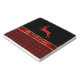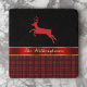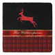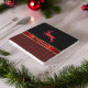 This festive town and country design features a rustic red and black plaid, almost like a buffalo plaid, offset with a fancy red and gold ribbon. At the top, a red reindeer is leaping in anticipation of Christmas eve. This mixture of two looks is a bit elegant but cozy at the same time. Your name or message of your choice appears above the ribbon in gold against a black background.