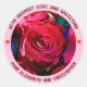 A bunch of fresh rose flowers of dark red or maroon color. The beauty of the summer season, the symbol of love. A digital painting from a photograph. A festive and colorful classic round sticker. Customizable. You can change two images of roses and a red heart and musical notes, and you can change or delete two template texts: WITH DEEPEST LOVE AND GRATITUDE and FROM ELIZABETH AND CHRISTOPHER. You can transfer this design to a variety of other products of your choice. Please, use the "Edit Design" button to adjust the picture to the shape of the particular product. It will transfer you to the Designer Tool. Use the "Fit/Fill" option (right-side menu of the Designer Tool). You can scale, rotate, flip the image on the product template, and you can add some text of your own to it. You can also change the type, color, location of the font, and the color of the ring-shaped background. Just be creative, buy one, have fun, and be happy!