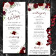 This beautiful wedding program features an elegant floral boho chic design with hand painted roses in shades of red, burgundy, and blush pink on a white background. The titles are written in fancy script calligraphy, and there is space for your ceremony and wedding party details, as well as a short thank you for your guest. Wonderful way to welcome your friends and family to your wedding celebration.