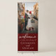 This solid burgundy wedding vertical banner features classic white script and a chic engagement photo of a bride and groom getting married at a formal evening venue. Embrace romance with this rich, bold color. Minimalist and romantic typography decor with a modern couple photograph.