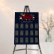 beautiful wedding seating chart featuring burgundy flowers with some elegant gold leaves on navy background