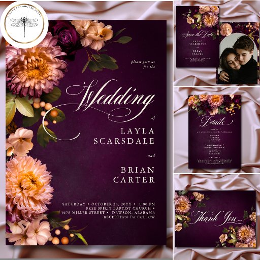 Elegant Burgundy Moody Floral Script Wedding Invitation