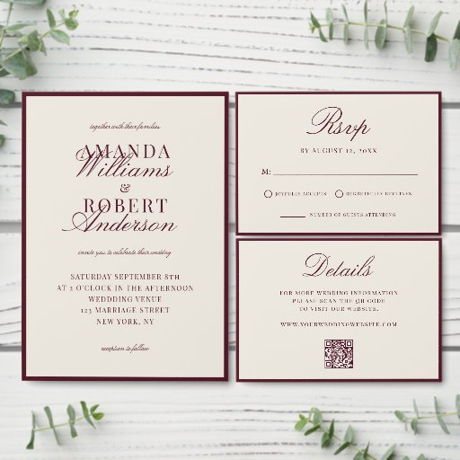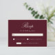 Create your own custom wedding RSVP cards in a luxurious old money style and burgundy red color.