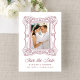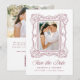 Announce your wedding with this elegant burgundy ornate frame photo save the date, featuring a hand-drawn antique picture frame that brings depth and warmth to the design. The front highlights the couple’s vertical engagement photo, with graceful calligraphy and refined serif lettering creating a balanced, formal layout. The back includes a horizontal engagement photo, along with custom text and a scannable QR code for sharing your wedding website with guests. This personalized photo save the date offers a romantic yet modern approach to announcing your wedding.